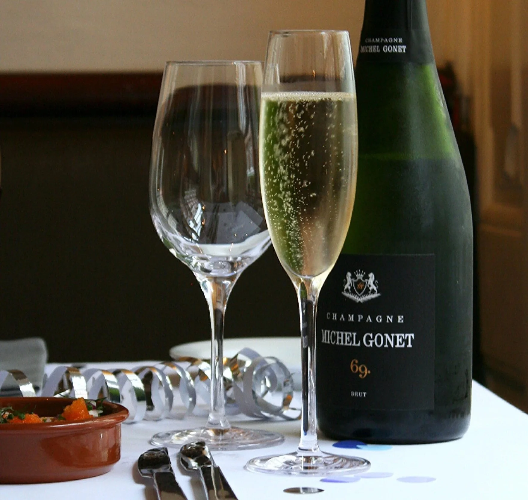 Vinmenuen er sammensat for at følge nytårsmenuens smagsrejse fra de første sprøde snacks til den søde afslutning.
